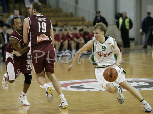 : Teemu Rannikko (no.9) of Union Olimpija (R) attacking while Dzenan Rahimic (no.19) of KK Bosna (M) and Ernest Bremer (no.22) of KK Bosna (L) are trying to stop him during NLB league match of 21. round between KK Union Olimpija, Ljubljana, Slovenia and KK Bosna Asa BH Telecom, Sarajevo, Bosnia and Hercegovina. Match ended with victory of Union Olimpija, who defeated KK Bosna ASA BTH with 93:68. Match between KK Union Olimpija and KK Bosna Asa BHT was played in Tivoli Arena in Ljubljana, Slovenia on 17. February 2007.
