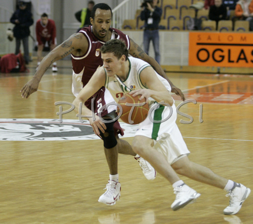: Dejan Hohler (no.10) of Union Olimpija (F) attacking next to Ernest Bremer (no.22) of KK Bosna (B) during NLB league match of 21. round between KK Union Olimpija, Ljubljana, Slovenia and KK Bosna Asa BH Telecom, Sarajevo, Bosnia and Hercegovina. Match ended with victory of Union Olimpija, who defeated KK Bosna ASA BTH with 93:68. Match between KK Union Olimpija and KK Bosna Asa BHT was played in Tivoli Arena in Ljubljana, Slovenia on 17. February 2007.