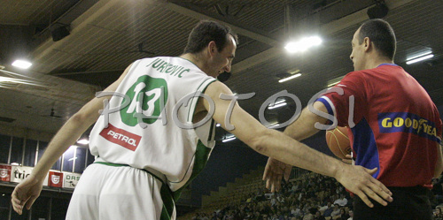 : Ivica Jurkovic (no. 13) of Union Olimpija (L) in discussion with referee during match of 22nd round of Basketball NLB League between KK Union Olimpija, Ljubljana, Slovenia and Helios Domzale, Slovenia. Match ended with victory of Helios Domzale, who defeated Union Olimpija with 64:59. Match between KK Union Olimpija and Helios Domzale was played in Tivoli Arena in Ljubljana, Slovenia on 25. January 2007.