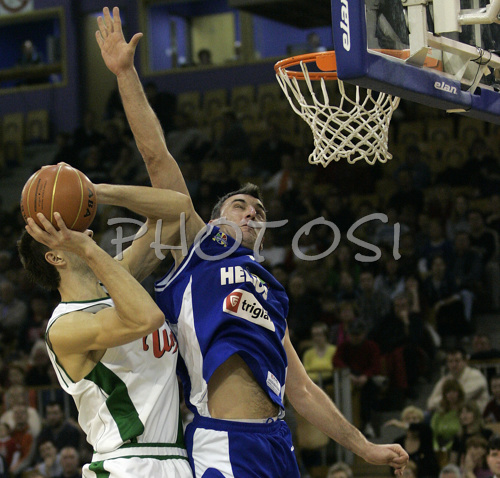 Ljubljana ,Slovenia - 25.02.2007 : Hasan Rizvic (no. 8) of Union Olimpija (L) and Sasa Doncic (no.4) of Helios Domzale (R) during match of 22nd round of Basketball NLB League between KK Union Olimpija, Ljubljana, Slovenia and Helios Domzale, Slovenia. Match ended with victory of Helios Domzale, who defeated Union Olimpija with 64:59. Match between KK Union Olimpija and Helios Domzale was played in Tivoli Arena in Ljubljana, Slovenia on 25. January 2007. Photo by: Primoz Jeroncic/PhotoSI