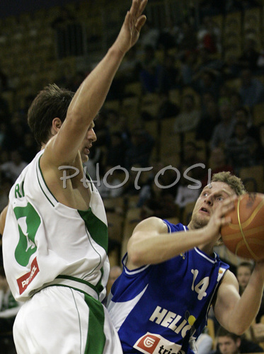 Ljubljana ,Slovenia - 25.02.2007 : Jure Mocnik (no.14) of Helios Domzale (R) and Goran Juran (no.4) of Union Olimpija (L) during match of 22nd round of Basketball NLB League between KK Union Olimpija, Ljubljana, Slovenia and Helios Domzale, Slovenia. Match ended with victory of Helios Domzale, who defeated Union Olimpija with 64:59. Match between KK Union Olimpija and Helios Domzale was played in Tivoli Arena in Ljubljana, Slovenia on 25. January 2007. Photo by: Primoz Jeroncic/PhotoSI