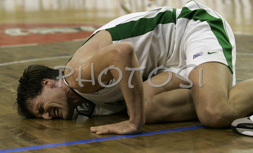 Ljubljana ,Slovenia - 25.02.2007 : Goran Juran (no.4) of Union Olimpija laying on floor in pain after injuring his ankle during match of 22nd round of Basketball NLB League between KK Union Olimpija, Ljubljana, Slovenia and Helios Domzale, Slovenia. Match ended with victory of Helios Domzale, who defeated Union Olimpija with 64:59. Match between KK Union Olimpija and Helios Domzale was played in Tivoli Arena in Ljubljana, Slovenia on 25. January 2007. Photo by: Primoz Jeroncic/PhotoSI