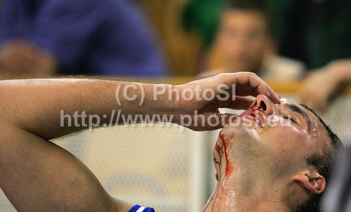 Ljubljana ,Slovenia - 14.04.2007 : Miha Zalokar (no.6) of Helios Domzale leaving field in blood after incident with Manuchar Markoishvili of Union Olimpija during match of 6th round of UPC Telemach Basketball League between KK Union Olimpija, Ljubljana, Slovenia and Helios Domzale, Slovenia. Match ended with victory of Helios Domzale, who defeated Union Olimpija with 82:87. Match between KK Union Olimpija and Helios Domzale was played in Tivoli Arena in Ljubljana, Slovenia on 14. April 2007. Photo by: Primoz Jeroncic/PhotoSI