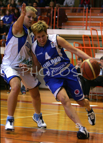 : Reeta Piipari (no.4) of Finland (R) and Katarina Ristic (no.10) of Slovenia (L) during match of additional qualification round for Women Basketball European Championships between Slovenia and Finland. Match ended with victory of Slovenia, who defeated Finland with 72:56. Match between Slovenia and Finland was played in Slovenske Konjice, Slovenia on 5. September 2007.