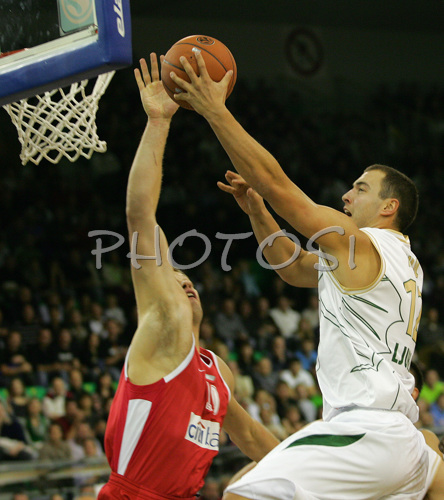 Ljubljana ,Slovenia - 01.11.2007 : Marko Milic (no.12) of Union Olimpija (R) scoring over Iakovos Tsakalidis (no.10) of Olympiacos (L) during match of 2nd round of Basketball Euroleague between Union Olimpija, Ljubljana, Slovenia and Olympiacos, Piraeus, Greece. Match ended with victory of Union Olimpija, who defeated Olympiacos with 87:78. Match between KK Union Olimpija and Olympiacos was played in Tivoli Arena in Ljubljana, Slovenia on 1. November 2007. Photo by: Primoz Jeroncic/PhotoSI