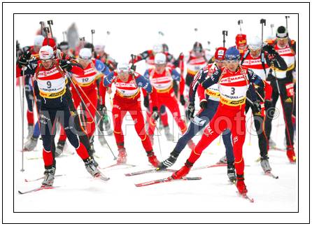 : Biathletes leaving starting place during mass start competition of the Biathlon World Cup in Pokljuka. Biathlon Ruhrgas World Cup was held on Pokljuka, Slovenia between 16. and 20.February 2005. Biathletes were competing on Sunday in 15km race with mass start, which was won by Ole Einar Bj?rndalen of Norway,Raphael Poiree of France placed second while Stian Eckhoff of Norway finished third.