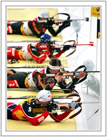 : Biathletes during first prone shooting during mass start competition of the Biathlon World Cup in Pokljuka. Biathlon Ruhrgas World Cup was held on Pokljuka, Slovenia between 16. and 20.February 2005. Biathletes were competing on Sunday in 15km race with mass start, which was won by Ole Einar Bj?rndalen of Norway,Raphael Poiree of France placed second while Stian Eckhoff of Norway finished third.