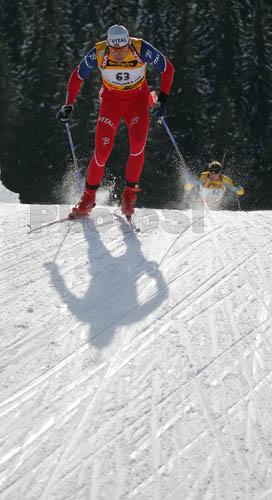 : Halvard Hanevold of Norway skiing during men sprint race of e.on Ruhrgas IBU Biathlon World cup which was held on Pokljuka, Slovenia on 8.March 2006.