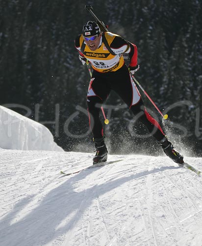 : Ludwig Gredler of Austria skiing during men sprint race of e.on Ruhrgas IBU Biathlon World cup which was held on Pokljuka, Slovenia on 8.March 2006.