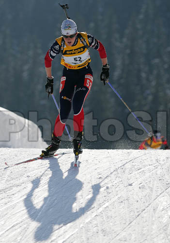 : Second placed Sandrine Bailly of France skiing during women sprint race of e.on Ruhrgas IBU Biathlon World cup which was held on Pokljuka, Slovenia on 9.March 2006.