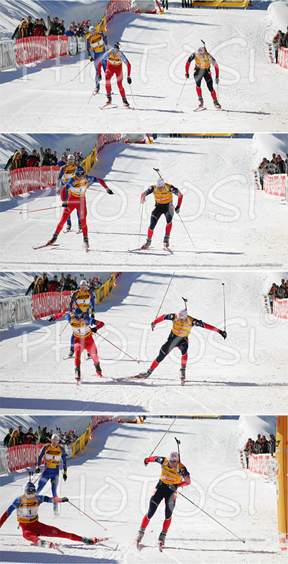 Pokljuka ,Slovenia - 26.03.2006 : Winner Ole Einar Bjoerndalen of Norway (M), second placed Raphael Poiree of France (R) and third placed Carl Johan Bergman of Sweden (L) sprinting for victory during men pursuit race of e.on Ruhrgas IBU Biathlon World cup which was held on Pokljuka, Slovenia on 11.March 2006. Photo by: Primoz Jeroncic/PhotoSI