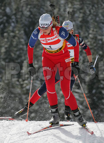 : Linda Tjorhom of Norway skiing during women pursuit race of e.on Ruhrgas IBU Biathlon World cup which was held on Pokljuka, Slovenia on 11.March 2006.