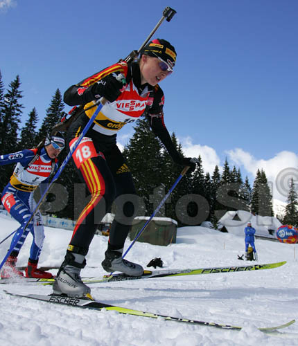 : Katrin Apel of Germany skiing during women pursuit race of e.on Ruhrgas IBU Biathlon World cup which was held on Pokljuka, Slovenia on 11.March 2006.