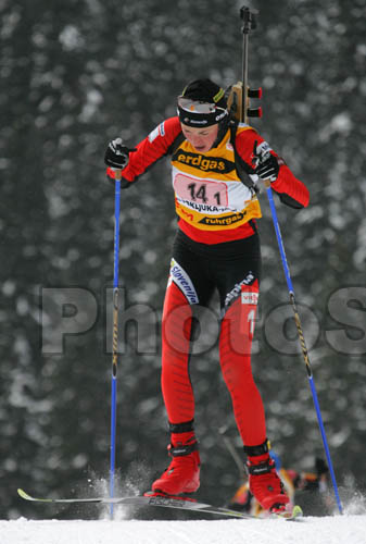 : Dijana Grudicek of Slovenia skiing during mixed relay race of IBU Biathlon World Championship which was held on Pokljuka, Slovenia on 12.March 2006. Race was won by relay of Russia, relay of Norway placed second, while relay of France finished third.