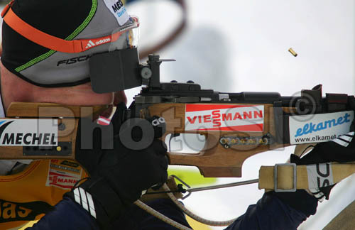 : Sergei Tchepikov of Russia shooting during mixed relay race of IBU Biathlon World Championship which was held on Pokljuka, Slovenia on 12.March 2006. Race was won by relay of Russia, relay of Norway placed second, while relay of France finished third.