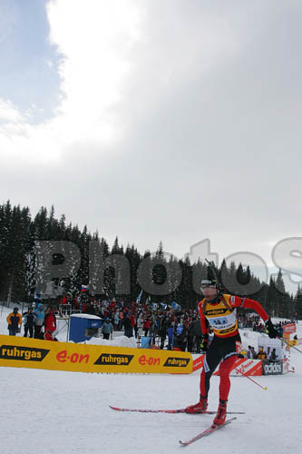: Klemen Bauer of Slovenia skiing during mixed relay race of IBU Biathlon World Championship which was held on Pokljuka, Slovenia on 12.March 2006. Race was won by relay of Russia, relay of Norway placed second, while relay of France finished third.