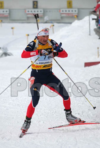 : Raphael Poiree of France leaving shooting place during mixed relay race of IBU Biathlon World Championship which was held on Pokljuka, Slovenia on 12.March 2006. Race was won by relay of Russia, relay of Norway placed second, while relay of France finished third.