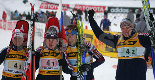 : Russian relay celebrating their victory in mixed relay race of IBU Biathlon World Championship which was held on Pokljuka, Slovenia on 12.March 2006. Race was won by relay of Russia, relay of Norway placed second, while relay of France finished third.