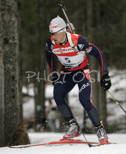 : Simon Fourcade of France skiing in men sprint race on Pokljuka, Slovenia. IBU Biathlon World Cup sprint race was held on Pokljuka, Slovenia on 18th of January 2007.