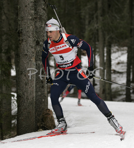 : Simon Fourcade of France skiing in men sprint race on Pokljuka, Slovenia. IBU Biathlon World Cup sprint race was held on Pokljuka, Slovenia on 18th of January 2007.