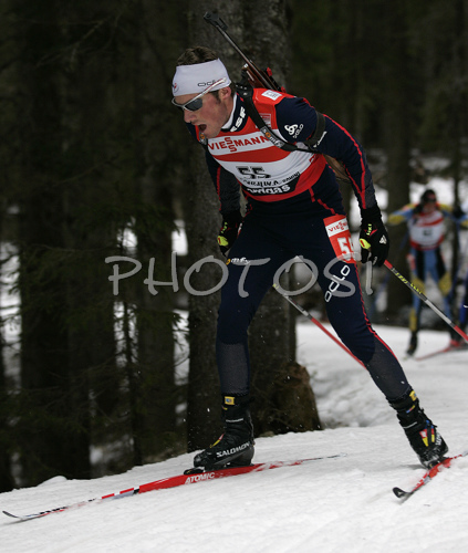 : Ferreol Cannard of France skiing in men sprint race on Pokljuka, Slovenia. IBU Biathlon World Cup sprint race was held on Pokljuka, Slovenia on 18th of January 2007.
