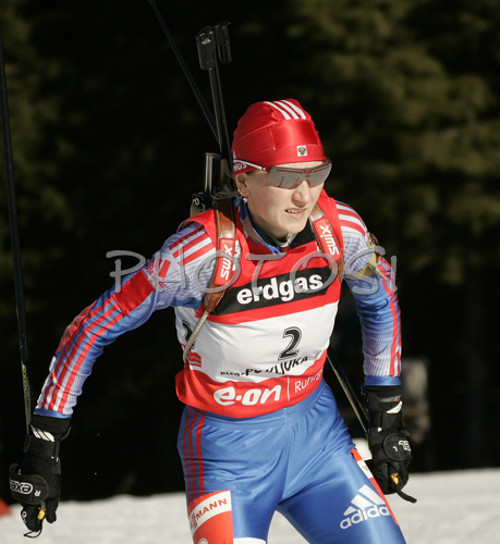 : Second placed Tatiana Moiseeva of Russia skiing in women pursuit race on Pokljuka, Slovenia. IBU Biathlon World Cup sprint race was held on Pokljuka, Slovenia on 19th of January 2007.