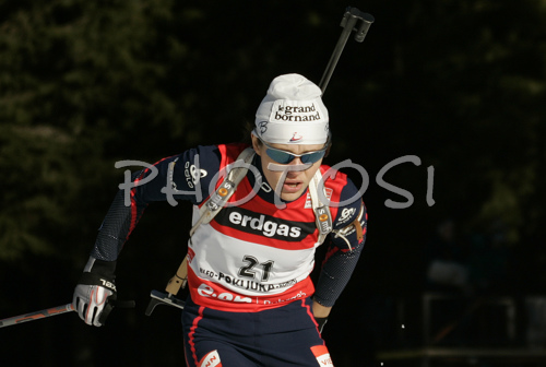 : Sylvie Becaert of France skiing in women pursuit race on Pokljuka, Slovenia. IBU Biathlon World Cup sprint race was held on Pokljuka, Slovenia on 19th of January 2007.