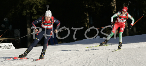 : Florence Baverel-Robert of France (L) and Natalya Sokolova of Belarus (R) skiing in women pursuit race on Pokljuka, Slovenia. IBU Biathlon World Cup sprint race was held on Pokljuka, Slovenia on 19th of January 2007.