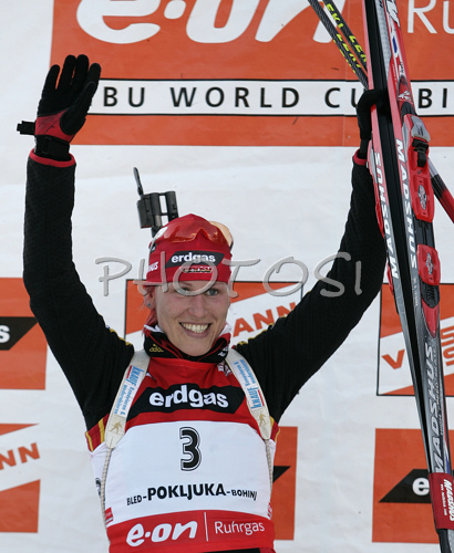 : Winner Kati Wilhelm of Germany celebrating her medal won in women pursuit race on Pokljuka, Slovenia. IBU Biathlon World Cup sprint race was held on Pokljuka, Slovenia on 19th of January 2007.