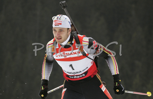 : Second placed Alexander Wolf of Germany skiing in men pursuit race on Pokljuka, Slovenia. IBU Biathlon World Cup sprint race was held on Pokljuka, Slovenia on 20th of January 2007.