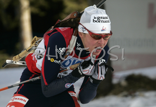 : Sylvie Becaert of France skiing in women mass start race on Pokljuka, Slovenia. IBU Biathlon World Cup sprint race was held on Pokljuka, Slovenia on 21th of January 2007.