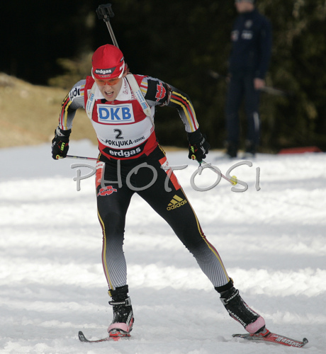 : Second placed Kati Wilhelm of Germany skiing in women mass start race on Pokljuka, Slovenia. IBU Biathlon World Cup sprint race was held on Pokljuka, Slovenia on 21th of January 2007.