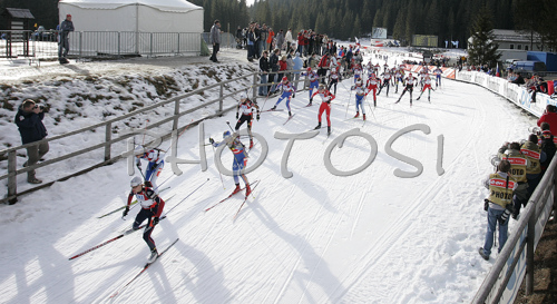 : Biathletes skiing after start of women mass start race on Pokljuka, Slovenia. IBU Biathlon World Cup sprint race was held on Pokljuka, Slovenia on 21th of January 2007.