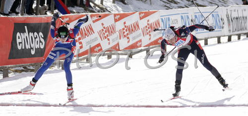 Pokljuka ,Slovenia - 21.01.2007 : Kaisa Mäkäräinen of Finland (L) and Florence Baverel-Robert of France (R) sprinting for 7th place in women mass start race on Pokljuka, Slovenia. IBU Biathlon World Cup sprint race was held on Pokljuka, Slovenia on 21th of January 2007.