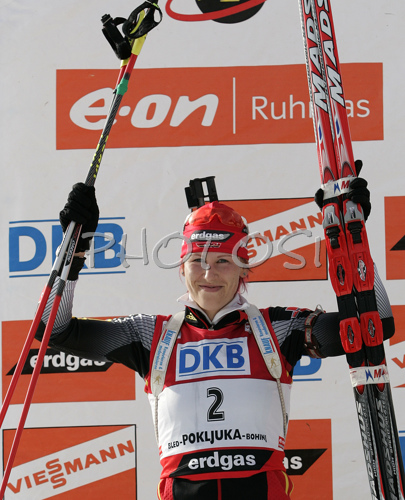 : Second placed Kati Wilhelm of Germany celebrating her medal won in women mass start race on Pokljuka, Slovenia. IBU Biathlon World Cup sprint race was held on Pokljuka, Slovenia on 21th of January 2007.