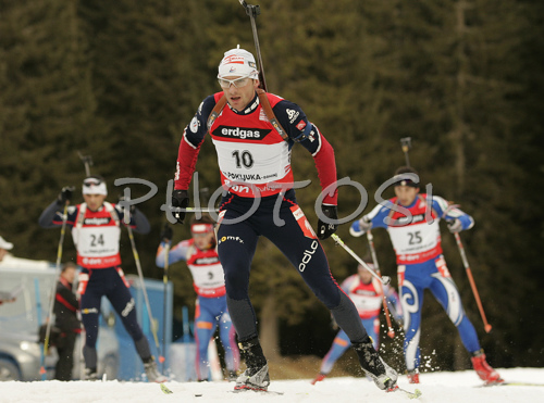 Pokljuka ,Slovenia - 21.01.2007 : Raphael Poiree of France being followed by Simon Fourcade of France, Dmitri Iarochenko of Russia and Christian De Lorenzi of Italy after second shooting in men mass start race on Pokljuka, Slovenia. IBU Biathlon World Cup sprint race was held on Pokljuka, Slovenia on 21th of January 2007. Photo by: Primoz Jeroncic/PhotoSI