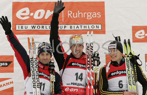 : Winner Christoph Sumann of Austria (M), second placed Vincent Defrasne of France (L) and third placed Andreas Birnbacher of Germany (R) celebrating their medals won in men mass start race on Pokljuka, Slovenia. IBU Biathlon World Cup sprint race was held on Pokljuka, Slovenia on 21th of January 2007.