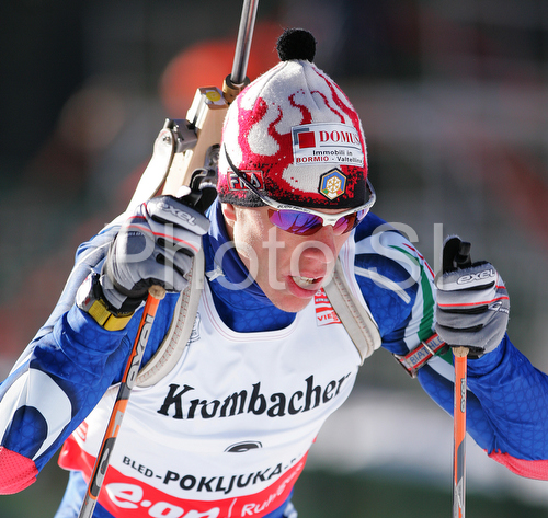 : Christian Martinelli of Italy skiing in men individual race of e.on Ruhrgas IBU Biathlon World Cup. Men individual race of e.on Ruhrgas IBU Biathlon World Cup was held in Pokljuka, Slovenia, on 13th of December 2007.