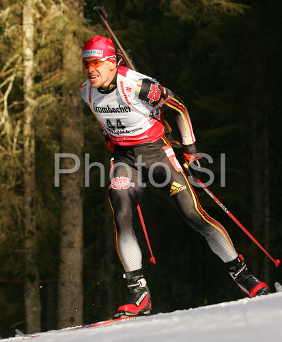 : Michael Greis of Germany skiing in men sprint race of e.on Ruhrgas IBU Biathlon World Cup. Men sprint race of e.on Ruhrgas IBU Biathlon World Cup was held in Pokljuka, Slovenia, on 15th of December 2007.