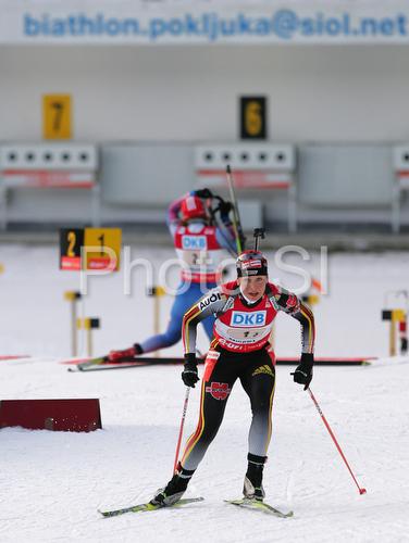 : Magdalena Neuner of Germany skiing out of shooting place in women relay race of e.on Ruhrgas IBU Biathlon World Cup. Women relay race of e.on Ruhrgas IBU Biathlon World Cup was held in Pokljuka, Slovenia, on 16th of December 2007.