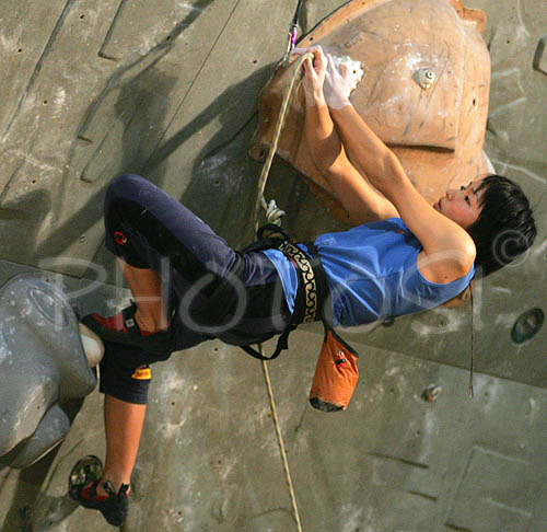 : Third placed after half finals Yuka Kobayashi of Japan is trying to secure herself during her half final climb in Climbing World Cup which was held in Kranj between 19. and 20. November 2005. Half finals were won by Angela Eiter of Austria in women competition and Flavio Crespi of Italy in men competition. Both of winners reached top of the route which gives them advantage for next days finals.