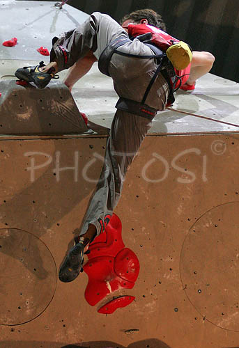 : Third placed Cedric Lachat of Switzerland during final climb in Climbing World Cup which was held in Kranj between 19. and 20. November 2005. Finals were won by Flavio Crespi of Italy, Jorg Verhoeven of Netherland finished second while Cedric Lachat of Switzerland placed third. All three climbers managed to overcome obstacles on final climb route and they reached top of wall.