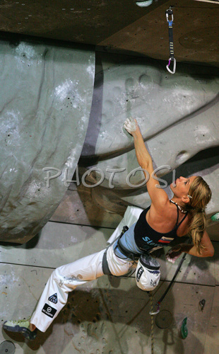 : Maja Vidmar of Slovenia climbing in half finals of last IFSC Sport Climbing World cup of 2007 season. Semi finals for last IFSC Sport Climbing World Cup of 2007 season were held in Kranj, Slovenia on 17th of November 2007.
