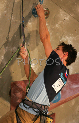: Klemen Becan of Slovenia climbing during men finals of last IFSC Sport Climbing World cup of 2007 season. Final race of IFSC Sport Climbing World Cup of 2007 season was held in Kranj, Slovenia on 18th of November 2007.