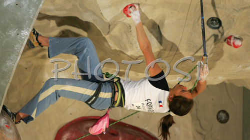 : Fourth placed Caroline Ciavaldini of France climbing during women finals of last IFSC Sport Climbing World cup of 2007 season. Final race of IFSC Sport Climbing World Cup of 2007 season was held in Kranj, Slovenia on 18th of November 2007.