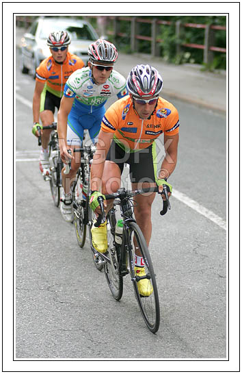 : Cyclists riding their bikes during road cycling race across the streets of Kranj. Cyclists had to finish more then 30 laps through streets of Kranj, before they had chance to sprint uphill for last time and try to win race. Valter Bonca of Sava Kranj won race after he was in leading group of three cyclists for more then 20 laps.