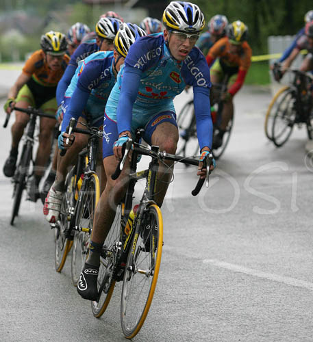 : Cyclists of elite group are cycling around streets of Sencur,Slovenia where Criterum of Sencur took place. Race with total lenght of 65km had 50 laps of 1.3km.
