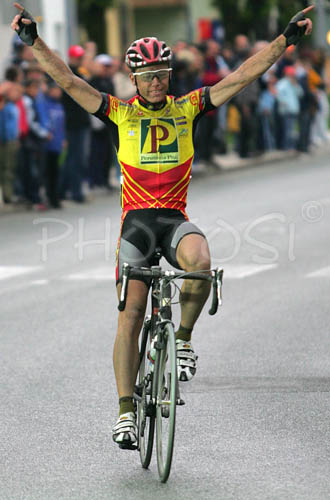 : Winner Matej Stare of Perutnina Ptuj is celebrating his victory in elite race around streets of Sencur,Slovenia where Criterum of Sencur took place. Race with total lenght of 65km had 50 laps of 1.3km.