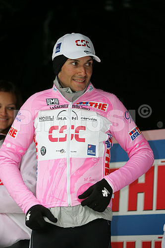 Passo di Furcia / Furkelsattel ,Italy - 24.05.2006 : Ivan Basso of Team CSC at winning podium takes the pink jersey as leader in general classification after 17th stage of Giro d Italia. Stage from Termeno/Tramin to Plan de Corones/Kronplatz was changed due to bad weather situation and finish was moved to Passo di Furcia/FurkelSattel. Stage was shortened from original 133km to 115 km. Photo by: Mitja Smid Bricelj/PhotoSI