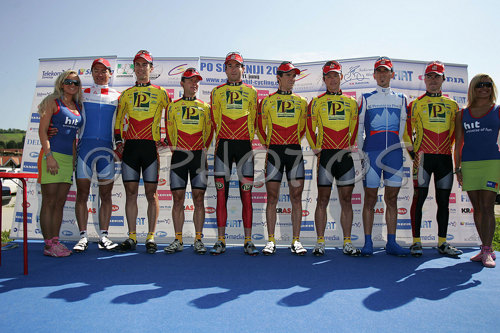 : Team Perutnina Ptuj, Slovenia at presentation before start of first stage in 13th Tour de Slovenie 2006 (13. dirka Po Sloveniji). First stage lead cyclists in lenght of 214km from Lendava, Slovenia to Brezice, Slovenia.